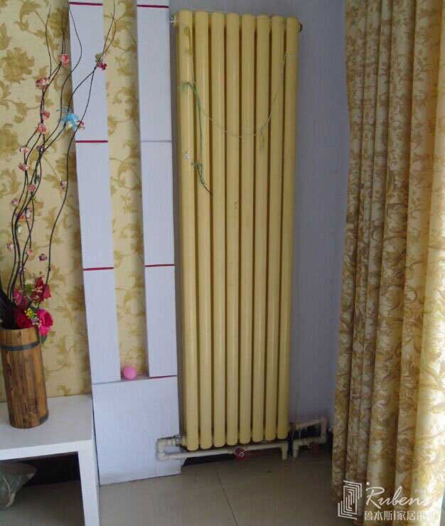 客廳影視牆旁米黃色暖氣片安裝效果圖,米黃色暖氣片與窗簾、牆紙顏色相協調,更增加了客廳的溫暖安適