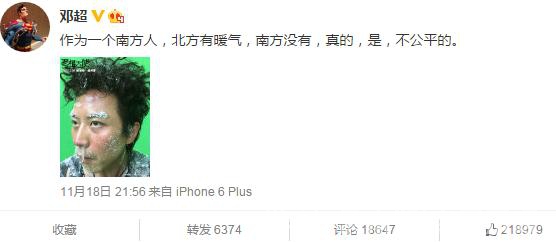 隨著天氣轉冷,網友紛紛關注起暖氣的問題,鄧超也在微博上曬出一張臉被凍僵、鼻涕流出來被凍成冰的照片,並附文稱“作為一個南方人,北方有暖氣,南方沒有,真的,是,不公平的。”