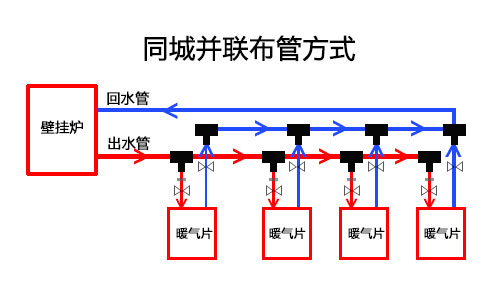 明裝暖氣片布管方式有雙管同程並聯和雙管異程並聯方式,一般前者使用較多。同程並聯特點是進水管道與各個暖氣片之間距離很近,受熱均勻方便維護。明裝方式進出水管道露在外麵,美觀上要比暗裝方式差一些,有些家庭使用扣槽將管道隱藏起來,緩解了外觀上的不足。