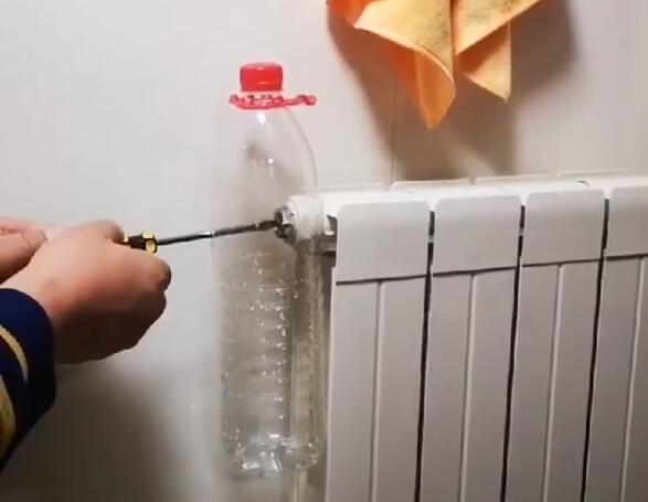 4、把打好洞的礦泉水瓶子洞口和暖氣閥一樣大的那邊固定在暖氣片閥門上,另一邊使用匹配的螺絲刀輕輕擰鬆放氣閥,聽到有氣體排出的聲音後停止扭動。這裏提醒,排氣閥比較小,在擰開的時候一定要小心操作,避免掉落丟失。